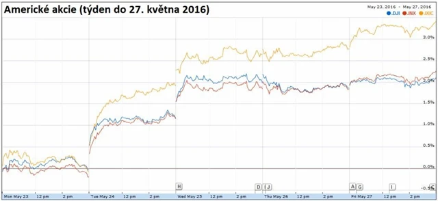 Americké akcie zahájily páteční seanci opatrným růstem a v plusu se držely celý den. V druhé polovině obchodování hlavní indexy ustály i projev šéfky Fedu Janet Yellenové, která během vystoupení na Harvardově univerzitě řekla, že by Fed měl brzy opatrně zvýšit úrokové sazby. Pozornost trhy věnovaly i revidované zprávě o vývoji americké ekonomiky na začátku letošního roku. V týdenním horizontu americké akcie zpevnily nejvíce za poslední dva měsíce.