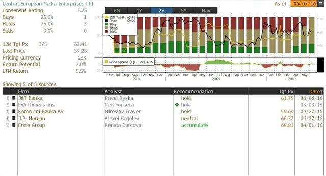 Pavel Ryska, analytik J&T Banky, zvýšil doporučení na akcie mediální firmy CME na "držet". Jako důvod uvádí pozvolné zlepšování hospodaření firmy.