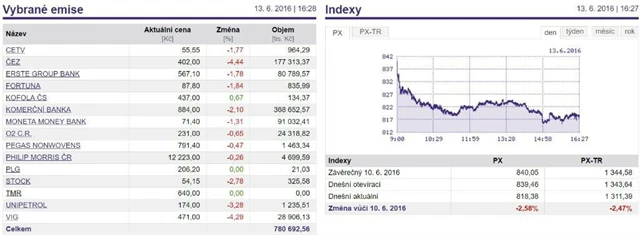 Index PX v pondělí odepsal 2,58 % na 818,38 bodu a index PX-TR očištěný o dividendy ztratil 2,47 %.