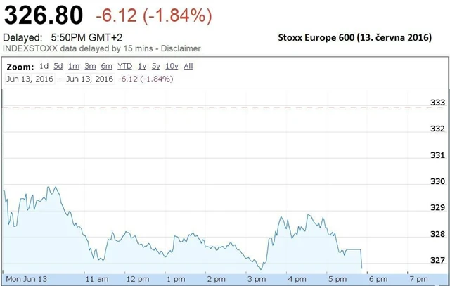 Evropské akcie se v pondělí pohybovaly převážně v červených číslech. Investoři vyčkávají před zasedáním americké centrální banky a obávají se blížícího se referenda o setrvání Spojeného království v Evropské unii.