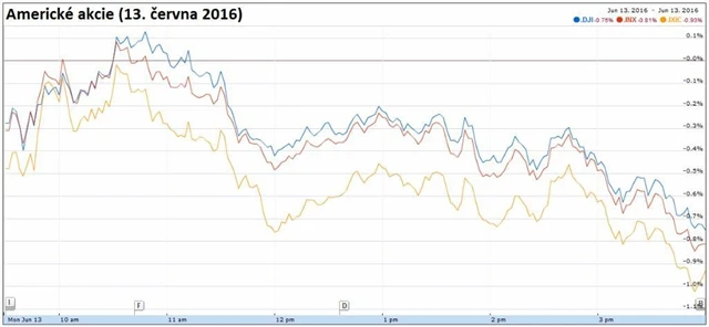 Dow ztratil 0,74 % a uzavřel na 17 732,48 bodu. Širší index S&P 500 klesl o 0,81 % na 2 079,06 bodu a index technologického trhu Nasdaq Composite se snížil o 0,94 % na 4 848,44 bodu. Index volatility VIX vystřelil o 23,14 % na 20,97 bodu a výnos 10letých vládních dluhopisů USA se snížil o tři bazické body na 1,6096 %.