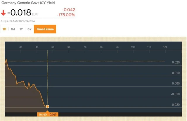 Výnos německých desetiletých dluhopisů klesl v úterý poprvé v historii na nulu a krátce se ocitl i pod ní kvůli obavám o růst světové ekonomiky a blížícímu se referendu v Británii.