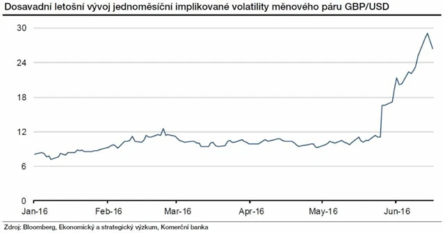 Měsíční implikovaná volatilita britské libry vůči americkému dolaru, která odráží očekávání, jak moc se kurz měny bude během nadcházejícího měsíce pohybovat, vzrostla za poslední měsíc téměř o 200 %. Za týden lze tedy podle tržních účastníků očekávat prudkou reakci libry na výsledek britského referenda.