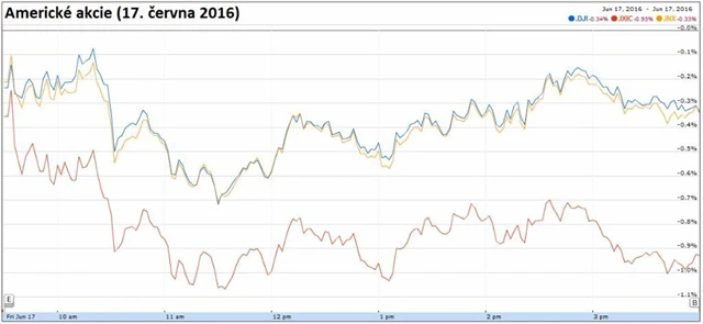 Dow klesl o 0,33 % na 17 675,16 bodu, širší S&P 500 odepsal 0,33 % na 2 071,22 bodu a Nasdaq Composite oslabil o 0,92 % na 4 800,34 bodu. Index volatility VIX stoupl o 0,21 % na 19,41 bodu a výnos 10letých vládních dluhopisů USA se zvýšil o tři bazické body na 1,61 %.