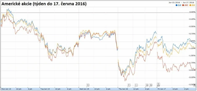 Americké akcie v pátek po čtvrtečním nárůstu znovu klesly a ztráty utrpěly i za celý uplynulý týden. Hlavní indexy v pátek srážely akcie Applu, který v Číně zabředl do patentového sporu. Investoři se mezitím připravovali na blížící se referendum o budoucnosti Spojeného království v Evropské unii. Libra vůči americkému dolaru přidala v pátek více než procento, když se trhem začaly šířit spekulace, že by se nerozhodnutí britští voliči mohli po tragické smrti labouristické poslankyně Jo Coxové, stoupenkyně setrvání Británie v EU, připojit k odpůrcům takzvaného brexitu.