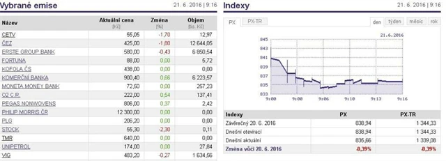 Index pražské burzy PX v prvních minutách úterního obchodování klesal o 0,39 %. Z velkých titulů se vedlo nejhůře likérce Stock Spirits (-2,3 %) a skupině ČEZ (-1,8 %), mírný vzestup zaznamenávaly pouze Komerční banka a operátor O2 C.R.