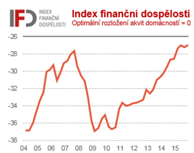 Index finanční dospělosti Generali Investments CEE ukazuje rozdíl jednotlivých kategorií aktiv od ideálního rozložení volných prostředků z pohledu výnosu i rizika. Podle aktuálních dat zůstává tento ukazatel hluboko v záporném pásmu. "V loňském roce se zastavil pozitivní trend, který byl nastartován na konci roku 2010, kdy se ekonomika i trhy začaly zotavovat z finanční a hospodářské krize. To potvrzuje i vývoj našeho indexu, který za celý rok vzrostl jen o 0,4 bodu na rovných 27 bodů. S ústupem obav z krize tak české domácnosti opět přistupují k hospodaření s financemi laxněji," říká analytik Martin Pohl z Generali Investments CEE.