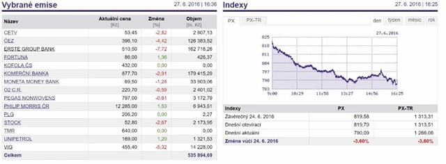 "Minulý týden zažily trhy černý pátek, přes víkend ale hlavy investorů příliš nevychladly. Nejistota z dopadů překvapivého výsledků britského referenda tak i dnes srážela především evropské akciové indexy, které odepsaly okolo tří procent," zhodnotil pondělní vývoj na burzách analytik Josef Němý z Komerční banky.