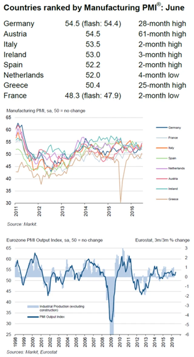 Růst aktivity zaznamenaly všechny evropské ekonomiky s výjimkou Francie, jejíž výrobní PMI byl na hodnotě 48,3 bodu, na kterou klesl ze 48,4 bodu v květnu. Růst táhly Německo (54,5 bodu, 28měsíční maximum) a Rakousko (54,5 bodu, 61měsíční maximum). Řecký PMI se po šesti měsících přehoupl nad 50 bodů - ožila výroba a výrobci vytvářeli nová pracovní místa. Zpracovatelský sektor tvoří zhruba deset procent řecké ekonomiky.
