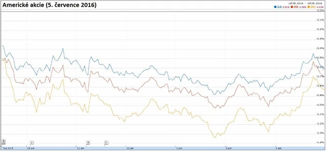 Americké akcie v úterý nenavázaly na příznivý trend z minulého týdne a zlevnily. V pondělí zůstaly trhy v zámoří kvůli Dni nezávislosti zavřené. Investoři se po přestávce začali vracet k otazníkům vznášejícím se nad výsledkem britského referenda z druhé poloviny června o budoucnosti Spojeného království v Evropské unii. Obnovené obavy z ekonomických dopadů takzvaného brexitu nepřály akciím, ropě ani britské libře.