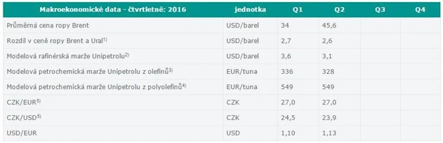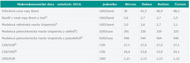 Za celé druhé čtvrtletí byl rozdíl v ceně ropy Brent a Ural 2,6 USD (1Q2016: 2,7 USD), rafinérská marže činila 3,1 USD (1Q2016: 3,6 USD), petrochemická marže z olefinů byla 328 eur za tunu (1Q2016: 336 eur) a petrochemická marže z polyolefinů byla 549 eur za tunu (1Q2016: 549 eur na tunu).