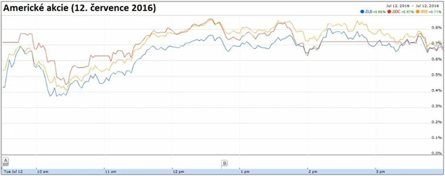Dow posílil o 0,66 % na zavírací maximum 18 347,67 bodu, širší S&P 500 připsal 0,7 % na zavírací maximum 2 152,14 bodu a index technologického trhu Nasdaq Composite přidal 0,69 % na 5 022,82 bodu. Historické maximum posunuly Dow na 18 371,95 bodu a S&P 500 na 2 155,40 bodu. Index volatility VIX vzrostl o 0,07 % na 13,55 bodu a výnos 10letých vládních dluhopisů USA se zvýšil zhruba o sedm bazických bodů na 1,505 %.
