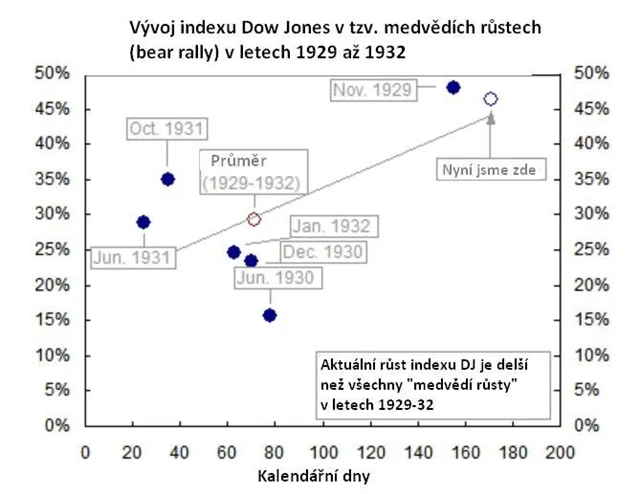 Letošní silný růst na americkém akciovém trhu se dá porovnat s vývojem na medvědím trhu v letech 1929-1932, kdy trhy také silně rostly po podobných událostech, jako byly krachy bank a předchozím hlubokém kurzovém výprodeji.
