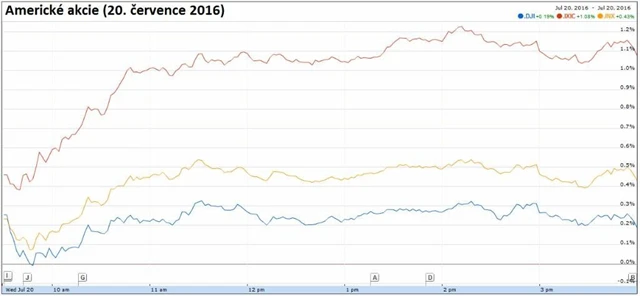 Index Dow posílil již podeváté v řadě, tentokrát o 0,19 % na nové zavírací maximum 18 595,03 bodu. Širší S&P 500 vzrostl o 0,43 % na nové zavírací maximum 2 173,02 bodu a index technologického trhu Nasdaq Composite se zvýšil o 1,06 % na 5 089,93 bodu.