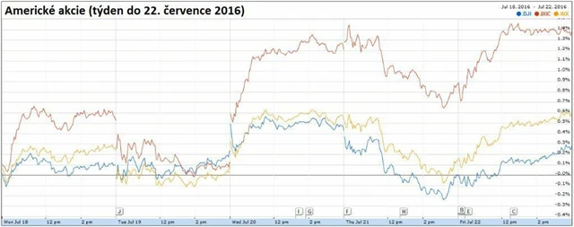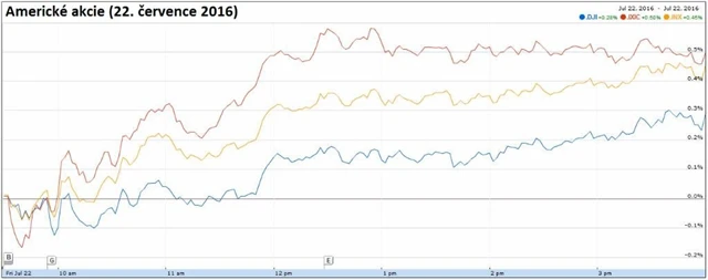 Americké akcie v pátek posílily, a hlavní akciové indexy se tak posunuly zpátky k rekordním maximům, na která se vyšplhaly v průběhu týdne. Dařilo se zejména telekomunikačním firmám. Americký dolar v závěru týdne vystoupil na více než čtyřměsíční maximum vůči koši světových měn, euro srážela mimo jiné zpráva o útoku v mnichovském obchodním centru.