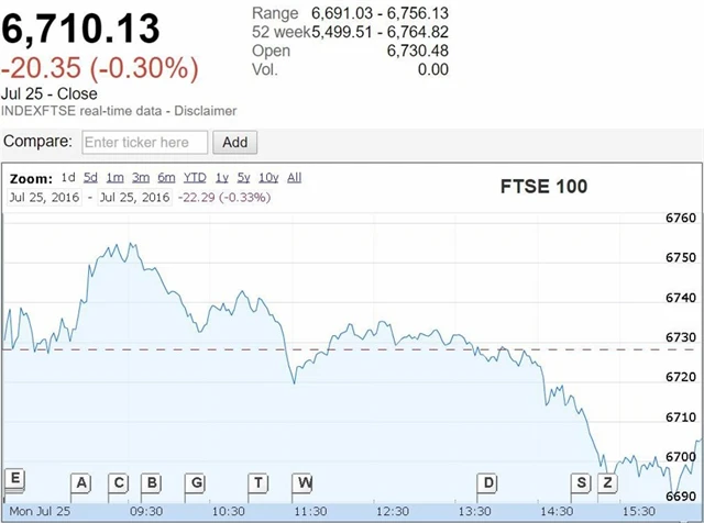 Britský FTSE 100 odepsal 0,3 %, přičemž dolů jej táhly zejména komoditní akcie. Klesající ceny ropy zapříčinily ztráty firem Tullow Oil, která odevzdala 5,42 %, a Randgold Resources, jež přišla o 1,88 %. Světové ceny ropy se během pondělního obchodování propadly na nejnižší úrovně za dva a půl měsíce. Dolů je tlačí zejména obavy investorů z nadbytečných dodávek na trh. Ropa Brent odpoledne klesla až na 44,80 USD za barel.