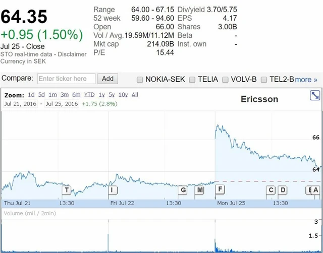 Výrazný pohyb v pondělí zažily akcie švédského výrobce telekomunikačních zařízení Ericsson. Firma oznámila, že s okamžitou platností odstupuje její generální ředitel Hans Vestberg, což vedlo k růstu titulu až o 5 %, v závěru však jeho zisk klesl na 1,5 %.