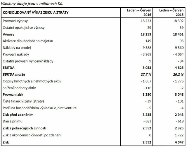 Provozní zisk před odpisy, amortizací a daněmi (EBITDA) vzrostl v prvním pololetí meziročně o 4,7 % na 5,05 miliardy Kč. K lepšímu výsledku pomohl i jednorázový výnos z prvního čtvrtletí ve výši 92 milionů Kč související s rozhodnutím správního soudu o ukončení řízení týkajícího se pokuty od Úřadu pro ochranu hospodářské soutěže. Ve druhém čtvrtletí dosáhl provozní zisk EBITDA 2,55 miliardy Kč, meziročně o 4,2 % více. EBITDA marže v prvním pololetí i ve druhém čtvrtletí dosáhla 27,7 %, meziročně se tak zvýšila o 1,5, respektive 1,3 procentního bodu.
