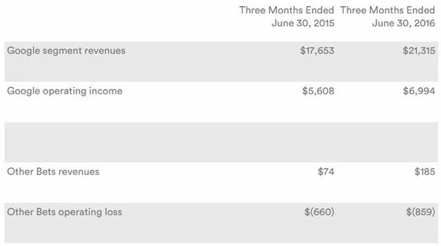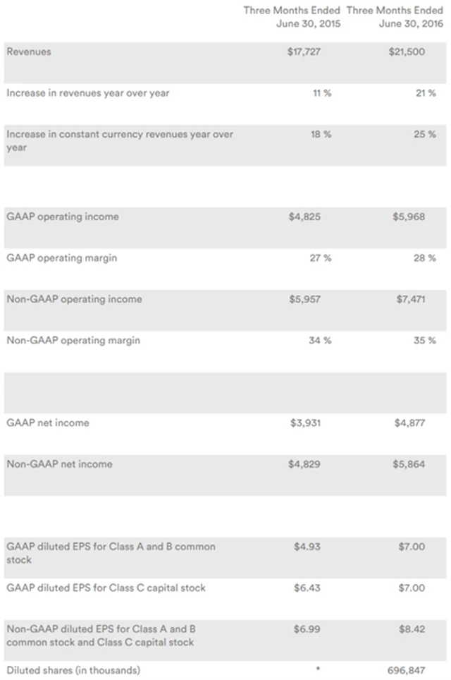 Alphabet ve druhém čtvrtletí vydělal 4,88 miliardy dolarů neboli sedm dolarů na akcii. O rok dříve společnost vykázala zisk 3,93 miliardy USD neboli 6,43 USD na akcii. Po očištění o mimořádné položky činil zisk Alphabetu 5,86 miliardy USD neboli 8,42 USD na akcii. Analytici v anketě agentury Bloomberg čekali upravený zisk na akcii 8,03 USD. Celkové tržby holdingu Alphabet vyskočily o 21 % na 21,5 miliardy USD a tržby po odečtení poplatků zaplacených partnerským internetovým stránkám dosáhly 17,5 miliardy USD. Trh čekal tržby po odečtení poplatků 16,86 miliardy USD.