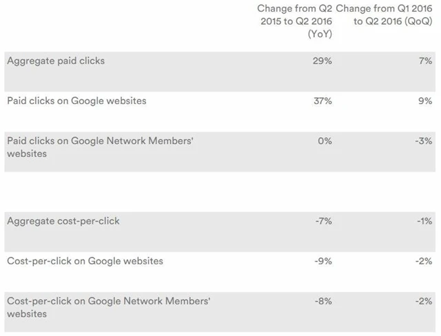 Počet placených kliků (na reklamní jednotky) se meziročně zvýšil o 29 % a mezikvartálně stoupl o 7 %. Na samotných webech Googlu se počet placených kliků meziročně zvýšil o 37 % a mezičtvrtletně stoupl o 9 %. Na webech zapojených do provozního systému se počet placených kliků meziročně nezměnil a proti prvnímu čtvrtletí klesl o 3 %.