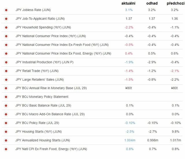 Bank of Japan ponechala v červenci sazby beze změny, navýšila ale program odkupů ETF. Data z japonské ekonomiky v pátek investory nenadchla