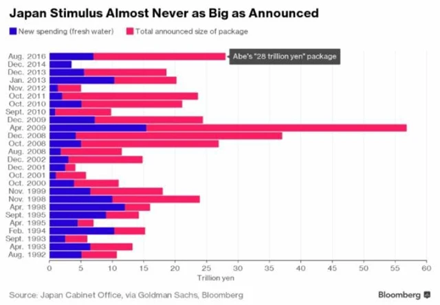 Celková hodnota stimulačních opatření dosahuje 28,1 bilionu jenů (6,7 bilionu Kč). Tento údaj však zahrnuje i projekty veřejně-soukromého partnerství a další položky, které nejsou přímými vládními výdaji a které by nemusely přinést hospodářskému růstu bezprostřední podporu, poznamenala agentura Reuters.