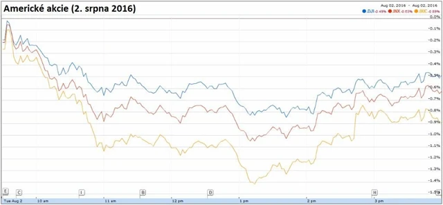 Dow oslabil o 0,49 % na 18 313,77 bodu, širší S&P 500 klesl o 0,64 % na 2 157,03 bodu a index technologického trhu Nasdaq Composite uzavřel se ztrátou 0,9 % na 5 137,73 bodu. Index volatility VIX vzrostl o 7,48 % na 13,37 bodu a výnos 10letých vládních dluhopisů USA se zvýšil o dva bazické body na 1,542 %.
