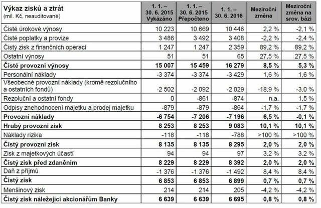 Čisté provozní výnosy bance vzrostly o 5,3 % na 16,28 miliardy Kč. Výnosy banky byly pozitivně ovlivněny jednorázovým příjmem náhrady za podíl ve společnosti Visa Europe. Bez zahrnutí této částky výnosy naopak klesly o 0,9 %. Čistý zisk bez vlivu zaúčtování příjmu za podíl ve Visa Europe klesl o 10,9 %.