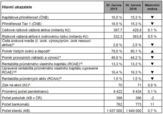 Ke konci června dosahoval ukazatel jádrové přiměřenosti Tier 1 úrovně 15,3 %. Komerční banka ovšem ve výsledkové zprávě upozornila, že ji ČNB informovala, že na základě posouzení jejího systémového významu by mělo dojít od 1. ledna 2017 ke zvýšení její rezervy na krytí systémového rizika na 3 % z 2,5 %. Tento požadavek doplňuje již dříve oznámené rozhodnutí ČNB zavést od 1. ledna 2017 proticyklickou kapitálovou rezervu ve výši 0,5 %. ČNB zároveň ve své Zprávě o finanční stabilitě poskytla přísnější výklad kapitálových pravidel Basel III, který ve svém důsledku povede ke striktnějšímu celkovému kapitálovému požadavku na banky, uvedla Komerční banka.