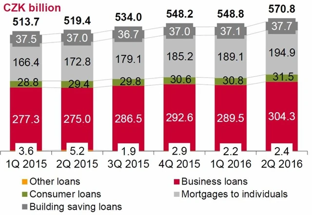 Celkový hrubý objem poskytnutých úvěrů se v pololetí meziročně zvýšil o 9,9 % na 570,8 miliardy Kč, přičemž úvěrování se zvýšilo ve všech kategoriích.