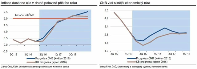 "Aktuální prognóza ČNB je relativně blízká té naší. Čekáme, že inflace by se kolem poloviny příštího roku měla přiblížit k cíli a dostat se pak krátce nad něj. Růst HDP očekáváme příští rok také kolem 3 %. Hlavním rozdílem mezi námi a ČNB zůstává pohled na ukončení kurzového závazku, kde očekáváme spíše až druhou polovinu roku 2017. Negativní vliv brexitu je rizikem pro pozdější opuštění závazku. Celkově ovšem bude záležet na situaci v eurozóně a měnové politice ECB," říká Jiří Polanský, analytik z České spořitelny.