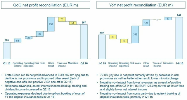 Čistý zisk Erste, který se zvýšil na 567 milionů eur z 261,4 milionu eur před rokem, byl pozitivně ovlivněn rozpuštěním rezerv a opravných položek ve výši 30 milionů eur (zejména v Rumunsku a v Maďarsku) a zaúčtováním kompenzace za podíl v kartové společnosti Visa Europe.
