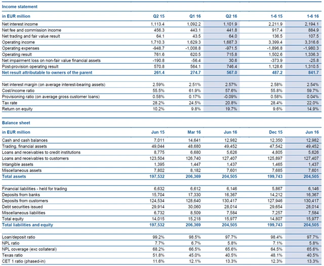 Čistý úrokový příjem banky klesl na 1,1 miliardy eur z 1,11 miliardy eur v loňském druhém čtvrtletí. Čistý příjem z poplatků a provizí činil za druhý kvartál 441,8 milionu eur, loni to bylo 456,3 milionu eur, a čistý zisk z obchodních operací a aktiv oceňovaných reálnou hodnotou dosáhl 64 milionů eur po 64,1 milionu eur v loňském druhém kvartálu.