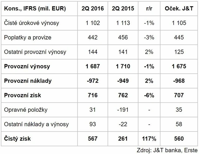 Celkové provozní příjmy Erste se ve druhém čtvrtletí meziročně snížily na 1,69 miliardy eur z 1,71 miliardy eur, zatímco provozní náklady se skupině zvýšily na 971,5 milionu eur z 948,7 milionu eur. Na úrovní provozního výsledku společnost vykázala zisk 715,8 milionu eur, před rokem to bylo 761,6 milionu eur a v předchozím čtvrtletí 620,5 milionu eur.