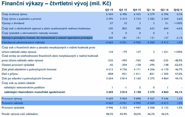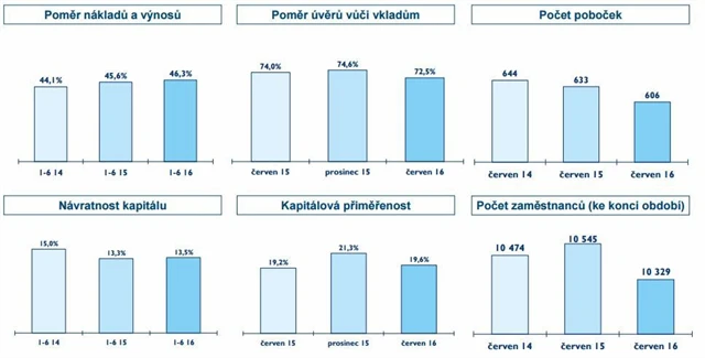 "Struktura výsledků byla víceméně bez překvapení, oproti našim odhadům byly vyšší jen ostatní výnosy. Úrokové výnosy klesají v posledních několika kvartálech již jen mírně (do 1 % za rok), což je důsledek kombinace pozvolného růstu úvěrů a mírného poklesu čisté úrokové marže. Marže za celé první pololetí dosáhla 2,54 % (2,58 % v 1H2015). Za růstem provozních nákladů stojí především růst mezd. Opravné položky podle očekávání dosáhly kladné hodnoty v důsledku zlepšení kvality portfolia na všech trzích a rozpouštění dříve vytvořených rezerv. Poměr nesplácených úvěrů dále výrazně klesl na 5,8 % (6,7 % v 1Q2016). Pozitivní je další růst kapitálové přiměřenosti," uvedl Milan Lávička, analytik z J&T Banky. "Vzhledem k dříve zveřejněnému předběžnému výsledku a zvýšení celoročního výhledu neočekáváme výraznější reakci na oznámená čísla. Ta potvrdila pokračování pozitivních trendů (stabilizaci marží, obnovující se růst úvěrů, růst kapitalizace a zlepšování kvality portfolia). Na druhou stranu se bance stále nedaří úplně zastavit pokračující pokles provozních výnosů a provozního zisku, který trvá již šestým rokem v řadě."