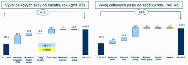 Proti loňskému prvnímu pololetí se změnila struktura aktiv - zvýšil se objem poskytnutých klientských úvěrů a objem vkladů uložených u ČNB, snížil se objem realizovatelných finančních aktiv. Na pasivní straně bilance stouply klientské vklady, mezibankovní vklady a objem vlastního kapitálu. Nižší byla i velikost vlastních emitovaných cenných papírů.
