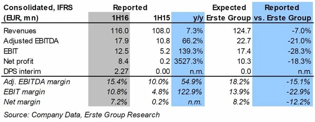 "Tržby proti velmi slabému loňskému prvnímu pololetí vzrostly o 7,3 % na 116 milionů eur, byly ale asi 7 % pod našimi odhady. To bylo částečně způsobeno nižší průměrnou prodejní cenou a stagnací tržeb v ČR (čekali jsme pokračující růst). Hrubá marže se v souladu s očekáváním snížila o 50 bazických bodů na 53,4 %. Upravený zisk EBITDA vzrostl o 66 % (pod naším očekáváním), přičemž růst byl podpořen především nízkou loňskou základnou," doplňuje Petr Bártek, analytik z České spořitelny.