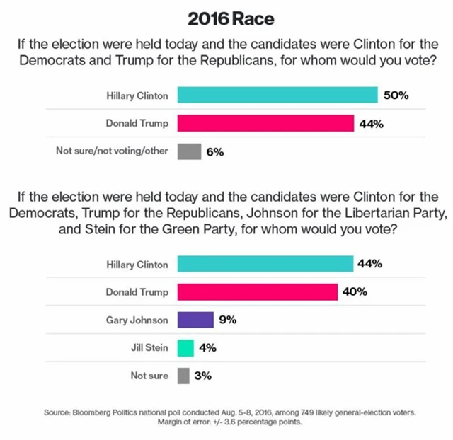 Pokud by se ve Spojených státech prezidentské volby konaly nyní a voliči by si měli vybrat mezi Hillary Clintonovou a Donaldem Trumpem, vyšla by ze souboje vítězně bývalá americká první dáma. Vyplývá to z celostátního průzkumu agentury Bloomberg. Hillary Clintonová má aktuálně na Donalda Trumpa náskok šest procentních bodů. Do preferencí ale začíná promlouvat i kandidát libertariánů, bývalý guvernér státu Nové Mexiko Gary Johnson.