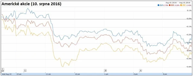 Dow klesl o 0,2 % na 18 495,66 bodu, širší S&P 500 odepsal 0,29 % na 2 175,49 bodu a index technologického trhu Nasdaq Composite uzavřel se ztrátou 0,4 % na 5 204,58 bodu. Index volatility VIX stoupl o 3,3 % na 12,05 bodu a výnos 10letých vládních dluhopisů USA se snížil o čtyři bazické body na 1,5074 %.