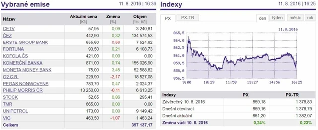 Index PX ve čtvrtek vzrostl o 0,24 % na 861,20 bodu.