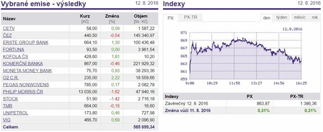 Dvě nejobchodovanější emise burzy, akcie Komerční banky a ČEZ, spadly v pátek do mínusu. Cenné papíry Komerční banky zlevnily o 0,46 % na 867 korun a akcie ČEZ o 0,54 % na 440,50 Kč. Další z hlavních emisí s velkým objemem obchodů, akcie Philip Morris ČR, si navíc připsaly i nejvýraznější propad, a to o 1,62 % na 13 035 korun.