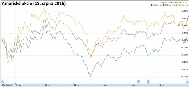 Index Dow vzrostl o 0,13 % na 18 597,70 bodu, S&P 500 stoupl o 0,22 %, na 2 187,02 bodu a index technologického trhu Nasdaq se zvýšil o 0,22 % na 5 240,15 bodu. Index volatility VIX spadl o 6,23 % na 11,43 bodu a výnos 10letých vládních dluhopisů USA se snížil o jeden a půl bazického bodu na 1,534 %.