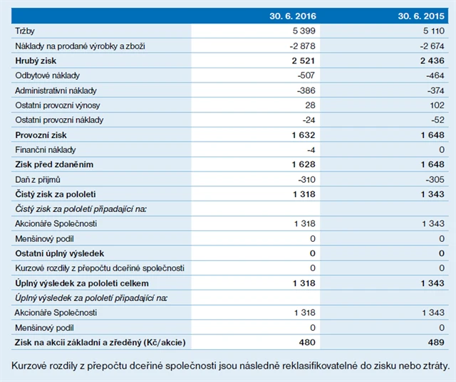 Provozní zisk v pololetí klesl o procento na 1,63 miliardy Kč a zisk před zdaněním se snížil o 1,2 % rovněž na 1,63 miliardy Kč. Tržby za výrobní služby v pololetí dosáhly 1,3 miliardy Kč, proti loňské první polovině roku se tak zvýšily o 13,7 %. Při vyloučení vlivu měnových kurzů se tržby bez spotřební daně a DPH zvýšily o 6,1 % a zisk z provozní činnosti klesl o 0,1 %.