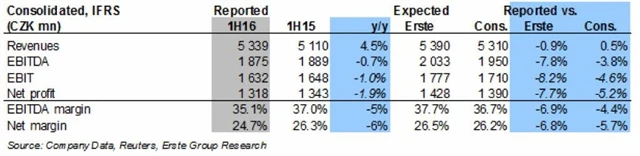 "Meziročně nižší čistý zisk byl důsledkem vyšších prodejních a administrativních nákladů firmy. Tržby zůstaly v samotném druhém čtvrtletí stabilní, zatímco my jsme očekávali mírný růst," říká Petr Bártek, analytik z České spořitelny. "Horší výsledky vycházely z nižší než očekávané hrubé marže (47,2 % proti očekávané hodnotě 49,3 %) a mírně vyšším správním, prodejním a režijním nákladům. Přesto reportovaný pololetní zisk na akcii 480 Kč poukazuje na dividendu nad 900 Kč (očekáváme mírně horší druhé pololetí kvůli novým regulacím), což představuje dividendový výnos kolem 7 %," dodává Bártek.