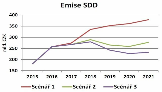 Pokud by ministerstvo financí pokračovalo ve vydávání převážně krátkých dluhopisů s dobou splatnosti do tří let (scénář 1), pak by celkové finanční potřeby státu (de facto tedy i emise SDD) byly v roce 2021 zhruba o 100 miliard korun vyšší v porovnání s umírněným scénářem 2, který počítá s nižším podílem emisí dluhopisů s krátkou dobou splatnosti v následujících pěti letech.