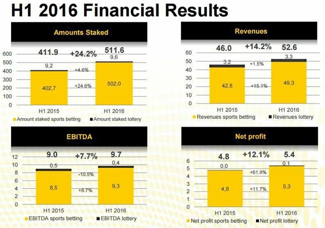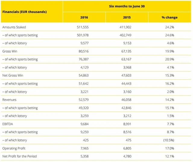 Celkový objem hrubých výher se v pololetí zvýšil o 19,9 % na 80,5 milionu eur a objem hrubých výher ze sportovního on-line sázení stoupl o 30,9 % na 50,2 milionu eur.