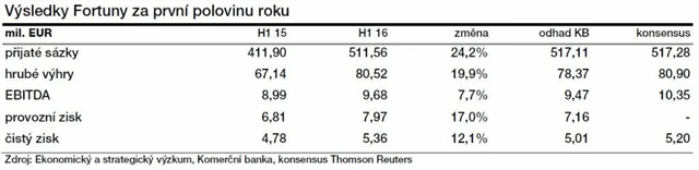 Sázkové kanceláři Fortuna v prvních šesti měsících letošního roku stoupl objem přijatých sázek proti stejnému období loňského roku o 24,2 % na 511,6 milionu eur. Na úrovni provozního zisku EBITDA Fortuna vykázala výsledek 9,7 milionu eur, proti loňskému prvnímu pololetí se tak firmě provozní zisk EBITDA zvýšil o 7,7 %. Čistý zisk pak Fortuně vyskočil o 12,1 % na 5,4 milionu eur. Výsledky podpořily rostoucí zájem o on-line sportovní sázení a fotbalové mistrovství Evropy.