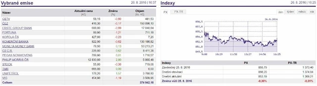 Za celý uplynulý týden akcie na pražské burze podle indexu PX posílily o 0,7 %. Největší pokles zaznamenaly akcie sázkové kanceláře Fortuna, nejlépe se naopak dařilo cenným papírům bankovní skupiny Erste.