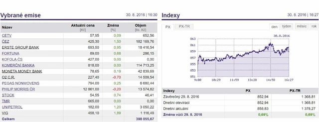 Celkový zobchodovaný objem byl v úterý s necelými 400 miliony Kč podprůměrný, nejobchodovanější byly tradičně akcie skupiny ČEZ a Komerční banky. Energetický gigant zpevnil o 1,50 % na 425,30 Kč, Komerční banka uzavřela na nule s 818 Kč za akcii.