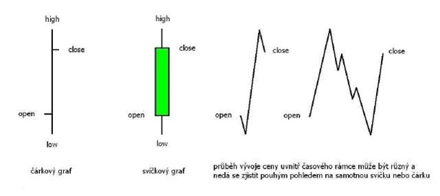 Ani čárkový ani svíčkový graf nám neukazuje přesný průběh vývoje ceny v průběhu časového rámce. Ten může být různý a pokud bychom jej chtěli zjistit, musíme analyzovat nižší časové rámce.